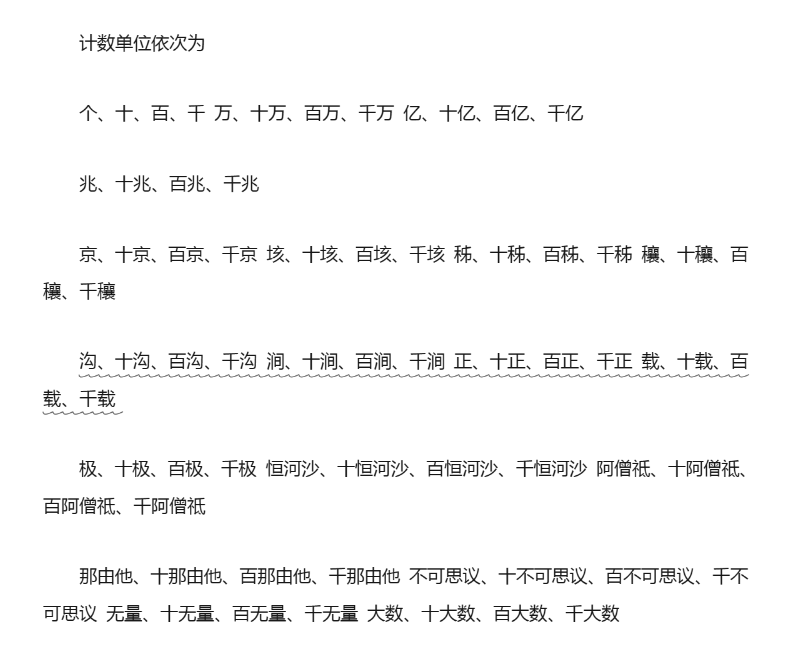 數字單位排行為:個、十、百、千、萬、十萬、百萬、千萬、億、十億、百億、千億 、兆、十兆、百兆、千兆、京、十京、百京、千京、垓、十垓、百垓、千垓、秭、十秭、百秭、千秭、穰、十穰、百穰、千穰、溝、十溝、百溝、千溝、澗、十澗、百澗、千澗、正、十正、百正、千正、載、十載、百載、千載、極、十極、百極、千極、恒河沙、十恒河沙、百恒河沙、千恒河沙、阿僧祗、十阿僧祗、百阿僧祗、千阿僧祗、那由他、十那由他、百那由他、千那由他、不可思議、十不可思議、百不可思議、千不可思議、 無量、十無量、百無量、千無量、大數、十大數、百大數、千大數、古戈爾、十古戈爾、百古戈爾、千古戈爾、頻波羅、十頻波羅、百頻波羅、千頻波羅。