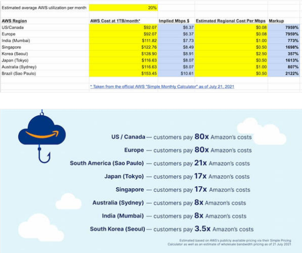 Cloudflare 根據(jù)自己從機(jī)房拿到的批發(fā)價(jià)推算,亞馬遜在北美和歐洲,向用戶收取的流量費(fèi),是批發(fā)價(jià)的80倍!機(jī)房的帶寬批發(fā)價(jià)是 1Mbps 收費(fèi)0.08美元,亞馬遜轉(zhuǎn)手賣給開發(fā)者,價(jià)格就是6.37美元!(帶寬與流量的換算關(guān)系,放到后面解釋。)