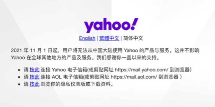 雅虎停止中國大陸產品與服務,據雅虎中國官網公告,2021年11月1日起,用戶無法從中國大陸使用Yahoo的產品與服務,但不影響Yahoo在全球其他地方的產品及服務。此外Yahoo旗下科技媒體Engadget宣布,11月1日起關閉提供簡體中文內容的“Engadget中國版”。